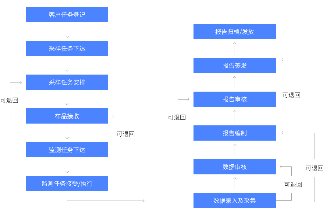 1、檢測(cè)業(yè)務(wù)流程管理:指監(jiān)測(cè)站各類的檢測(cè)業(yè)務(wù)的流程在系統(tǒng)中流轉(zhuǎn),業(yè)務(wù)模塊分客戶任務(wù)登記、采樣任務(wù)下達(dá)、采樣任務(wù)安排、樣品接收、檢測(cè)任 務(wù)下達(dá)、檢測(cè)任務(wù)接受/執(zhí)行、數(shù)據(jù)錄入及采集、數(shù)據(jù)審核、報(bào)告編制、報(bào)告審核、報(bào)告簽發(fā)及報(bào)告歸檔/發(fā)放等部分;